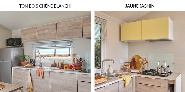 - Le ton bois ‘‘noyer’’, spécifique de la collection 2026, se retrouve également sur la table de la salle à manger et sur les portes de meublants hauts de la cuisine.